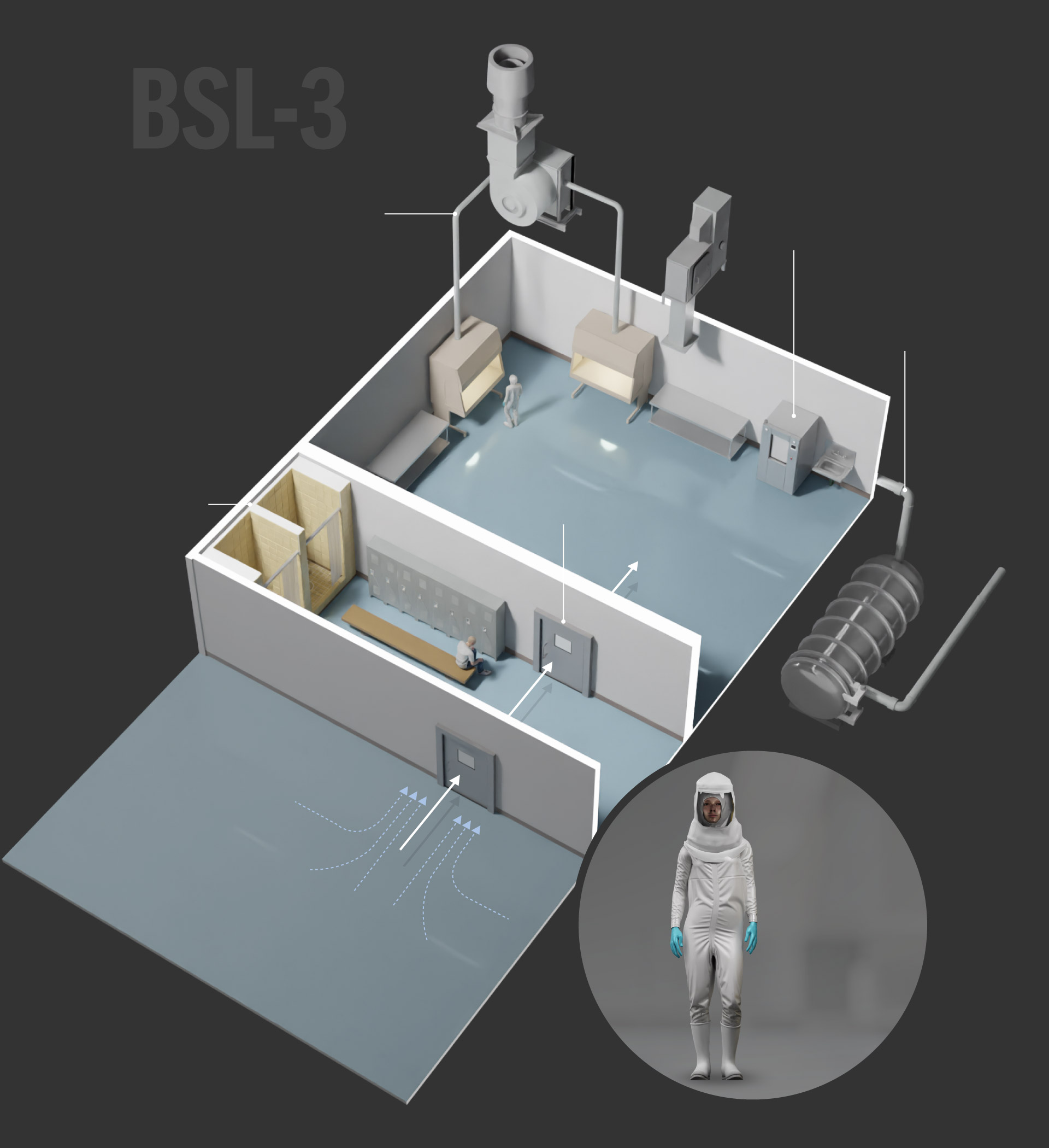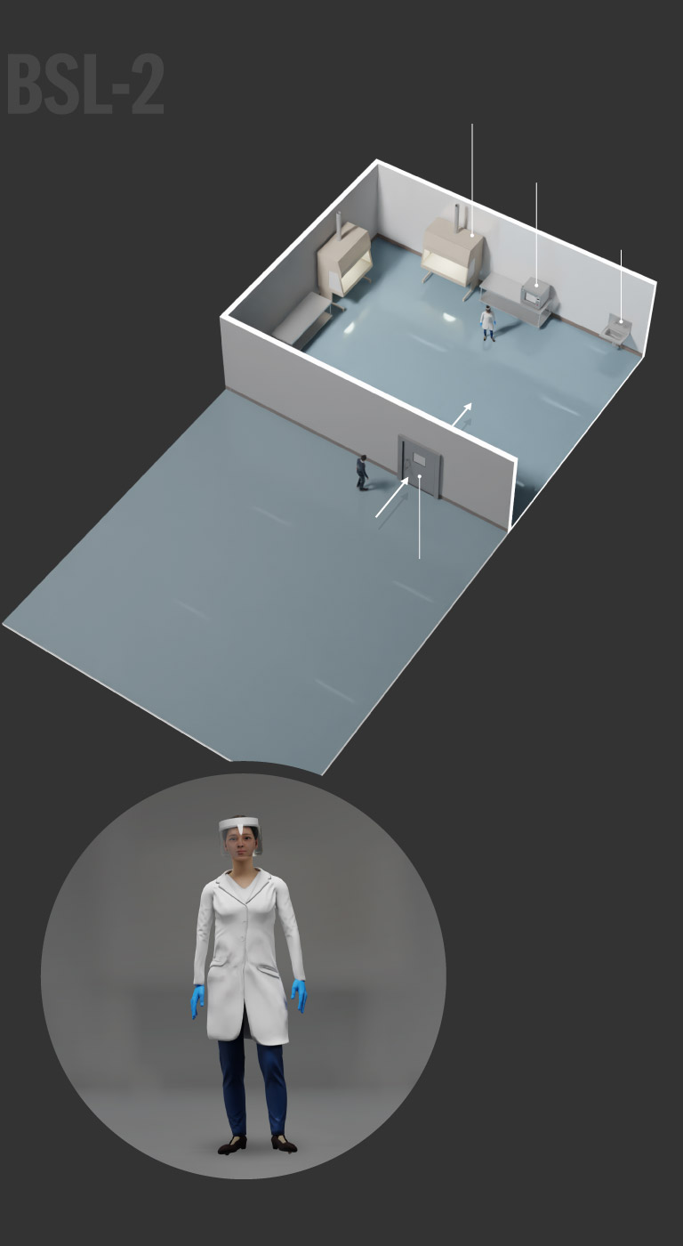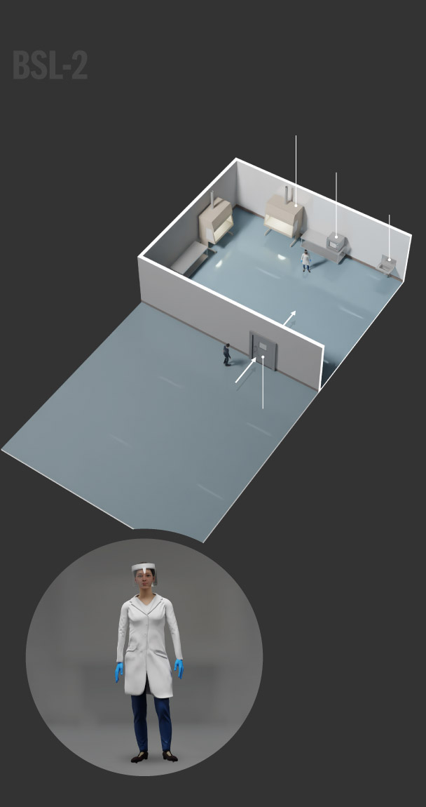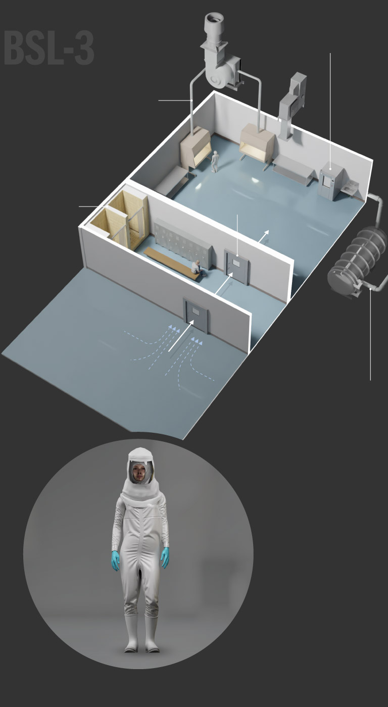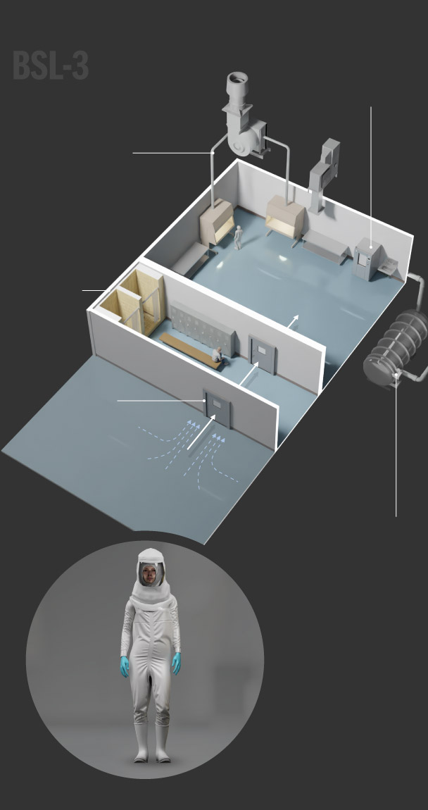 BSL-3 labs are used to study infectious pathogens that may be transmitted through the air and could cause lethal infections if exposed. Additional requirements are sealed walls, two self-closing doors, and directional airflow and filtered ventilation. These labs also must have equipment that can decontaminate wastewater.