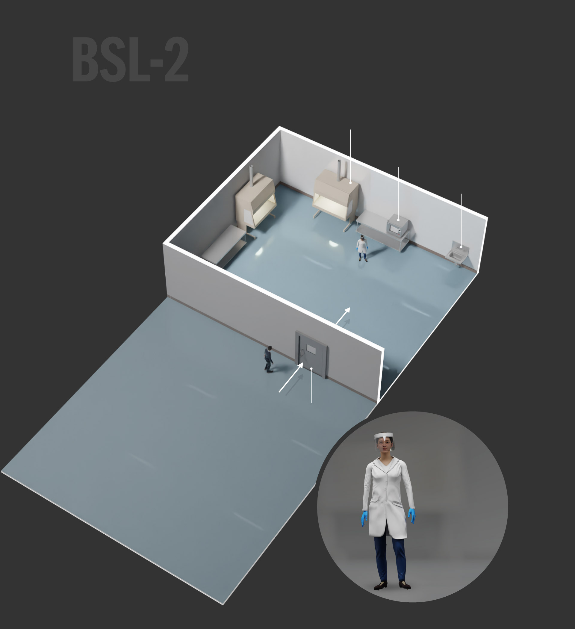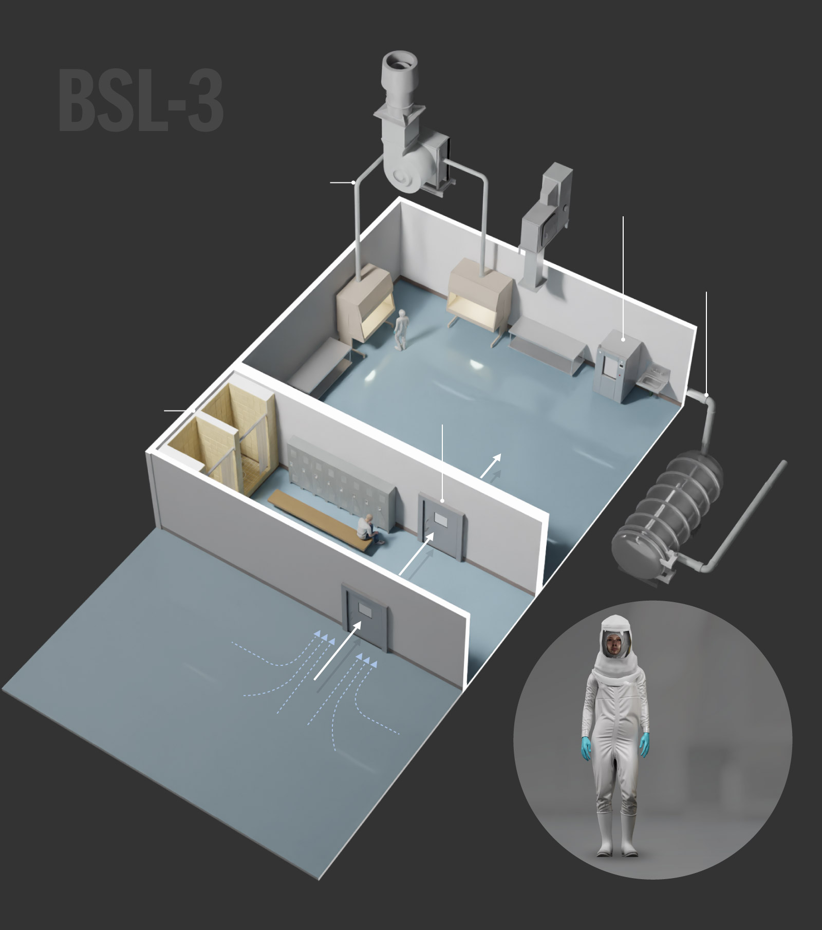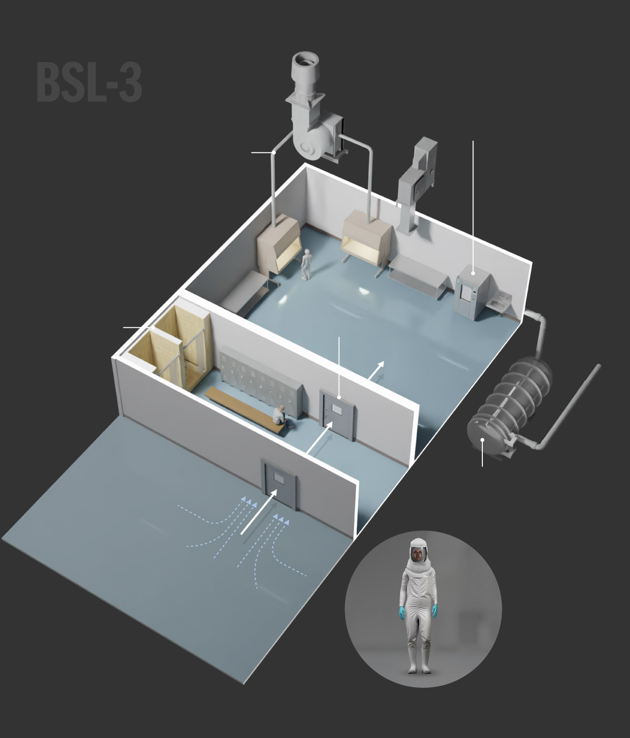 BSL-3 labs are used to study infectious pathogens that may be transmitted through the air and could cause lethal infections if exposed. Additional requirements are sealed walls, two self-closing doors, and directional airflow and filtered ventilation. These labs also must have equipment that can decontaminate wastewater.