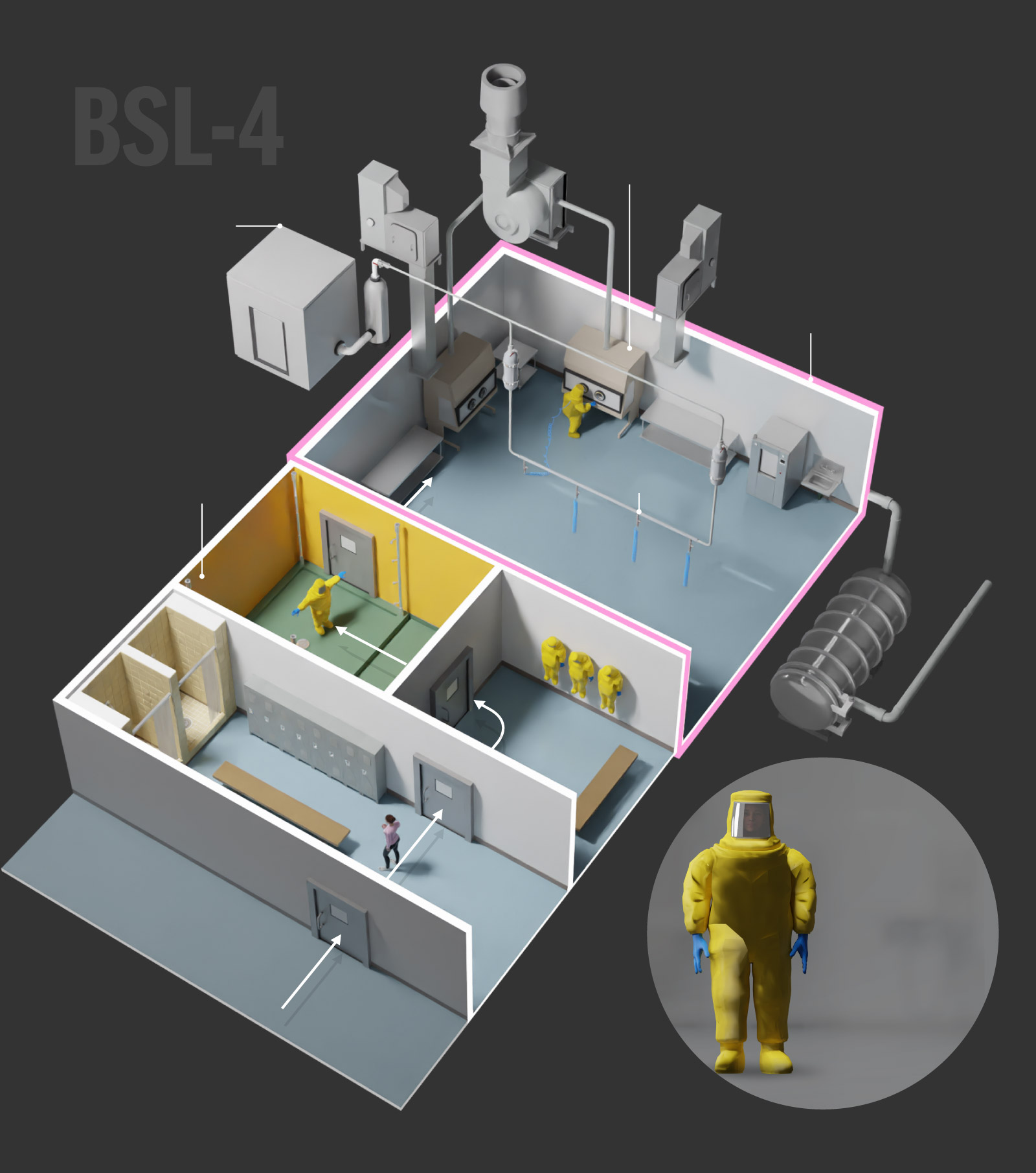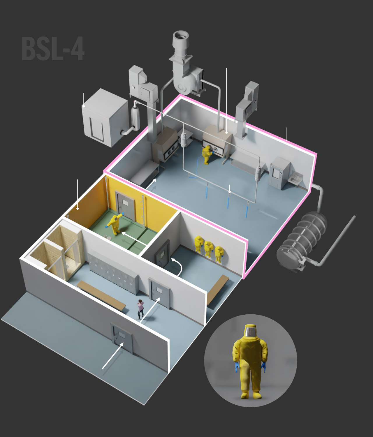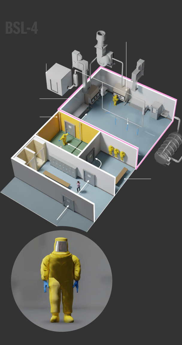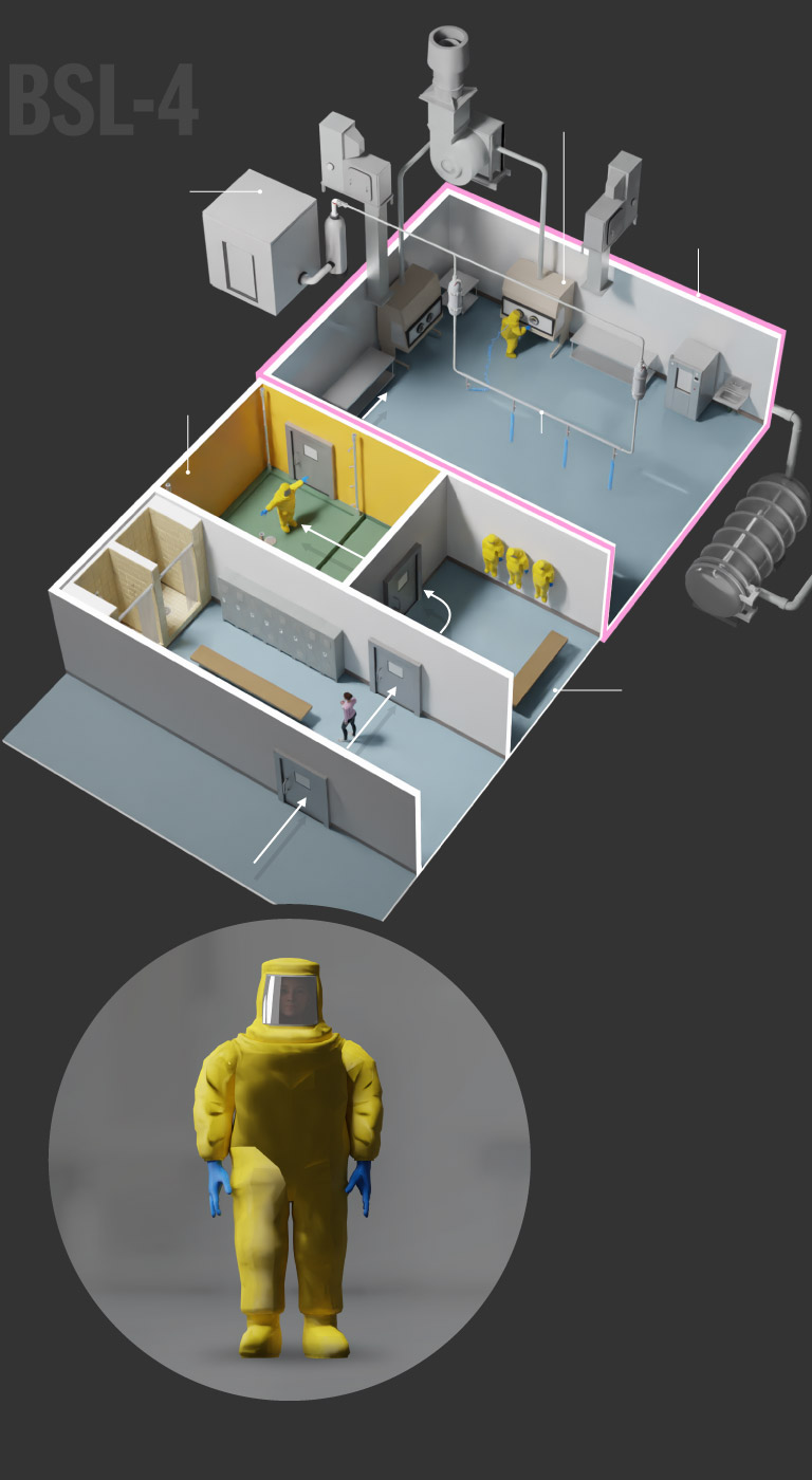BSL-4 labs require the highest level of security and safety because researchers study pathogens that can cause airborne infections, lead to