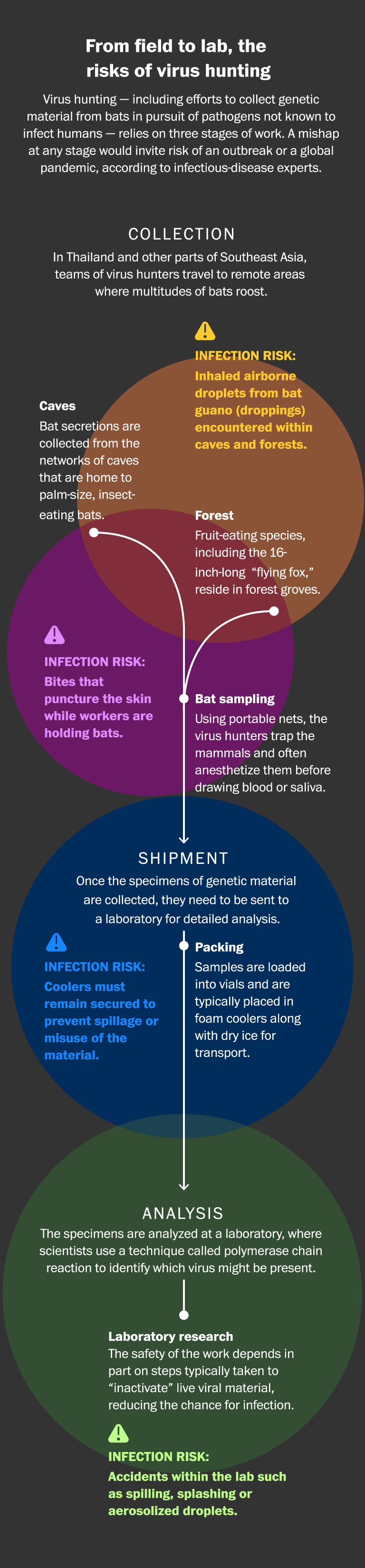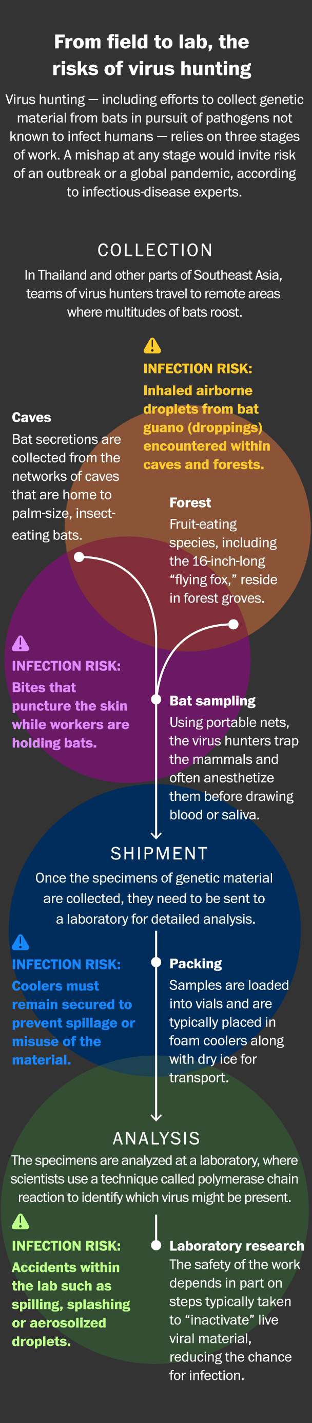 Beginning in 2011, Thai researchers made repeated treks every year to remote caves and forests inhabited by millions of bats, including species known to carry diseases deadly to humans. The scientists collected saliva, blood and excrement from the wriggling, razor-fanged animals, and the specimens were placed in foam coolers and driven to one of the university’s labs in Bangkok, a metropolis of more than 8 million people.