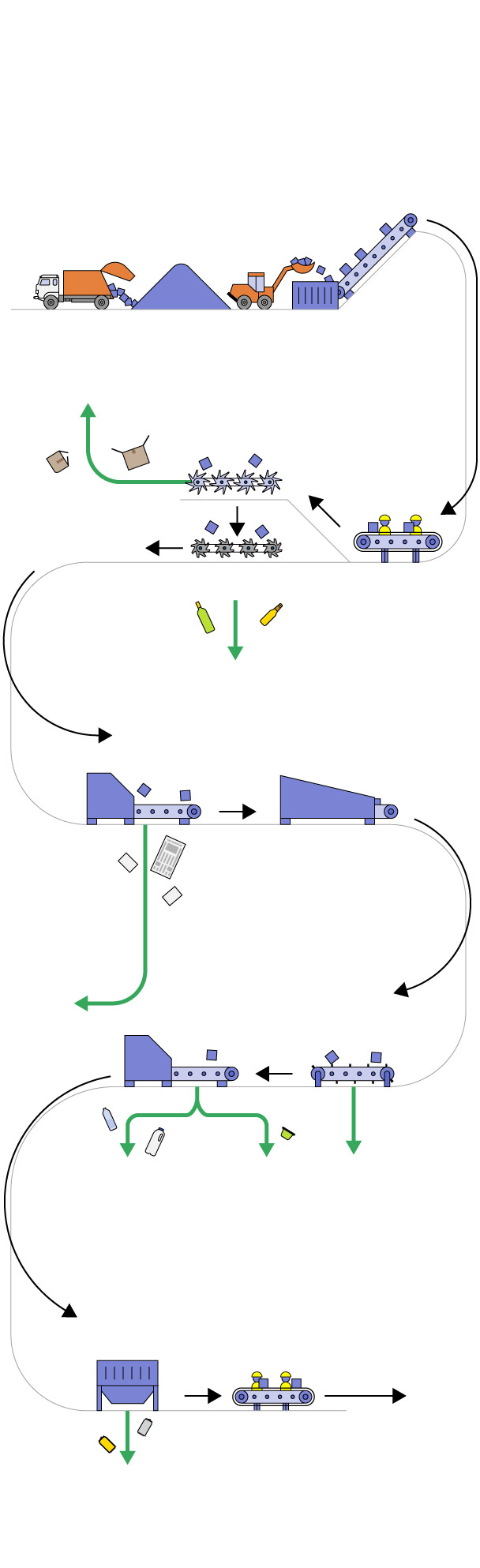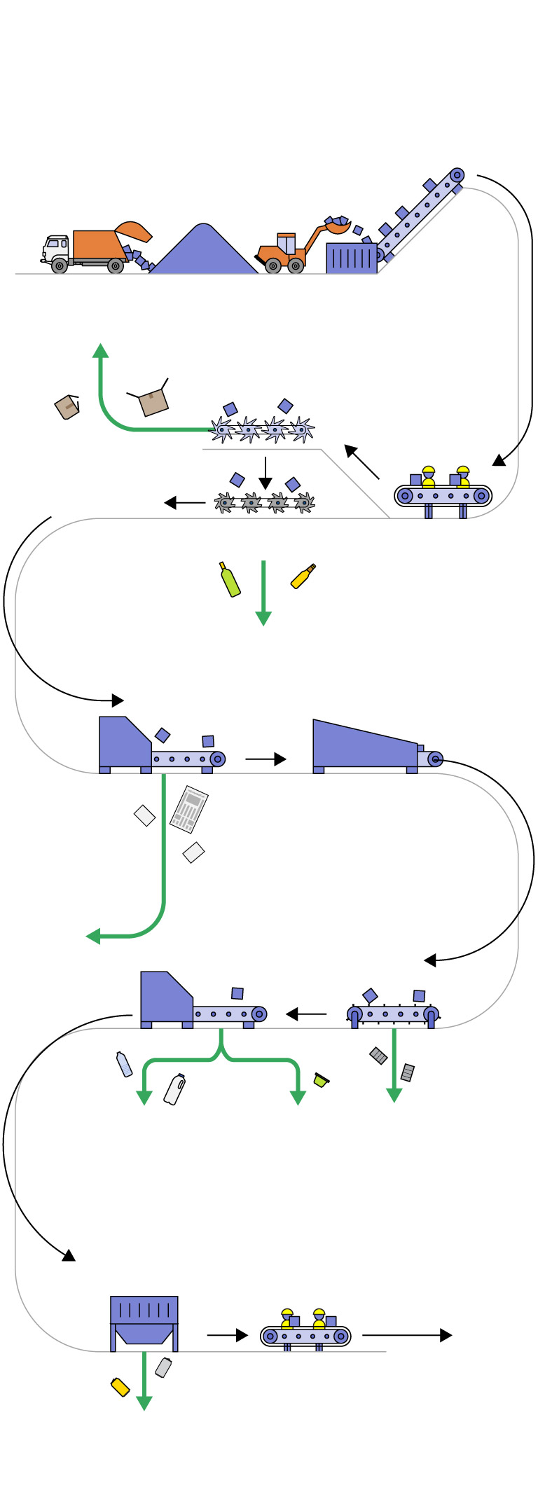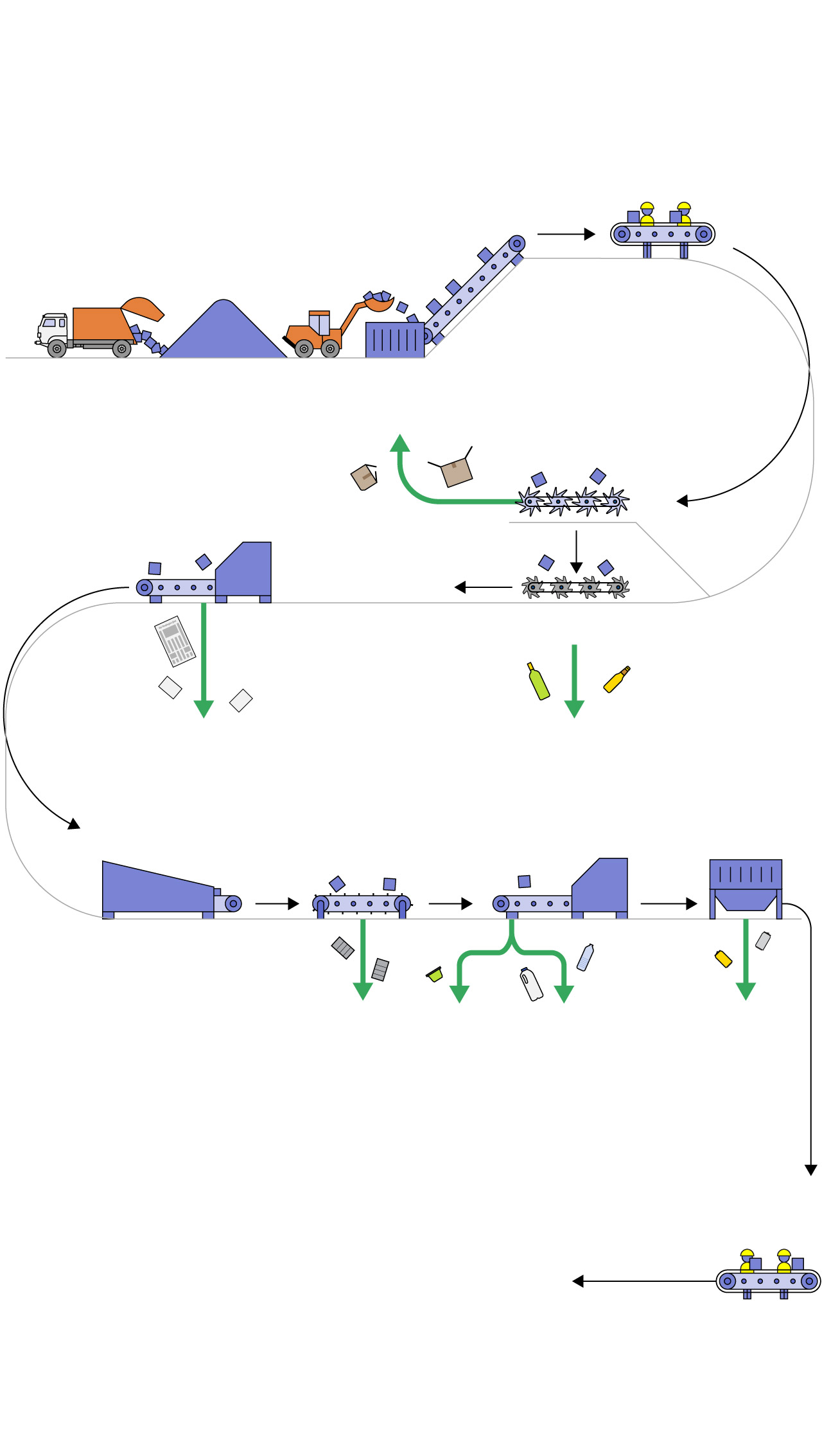 This is the basic sorting process at the Manassas, Va., materials recovery facility. The types of equipment and the arrangement of the machines may be different in other places.